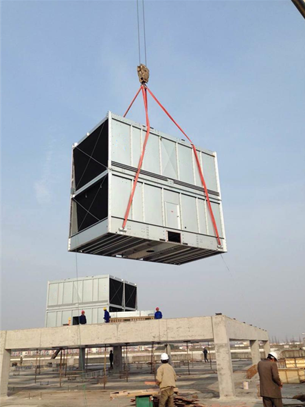 惠州東江環保橫流方形冷卻塔安裝 廣東特菱空調(http://www.cqxd999.com)方形橫流式玻璃鋼冷卻塔結構特點: (1)擋板:玻璃鋼材質,表面光滑美觀,耐腐蝕,防老化。 (2)填料:改性聚氯
